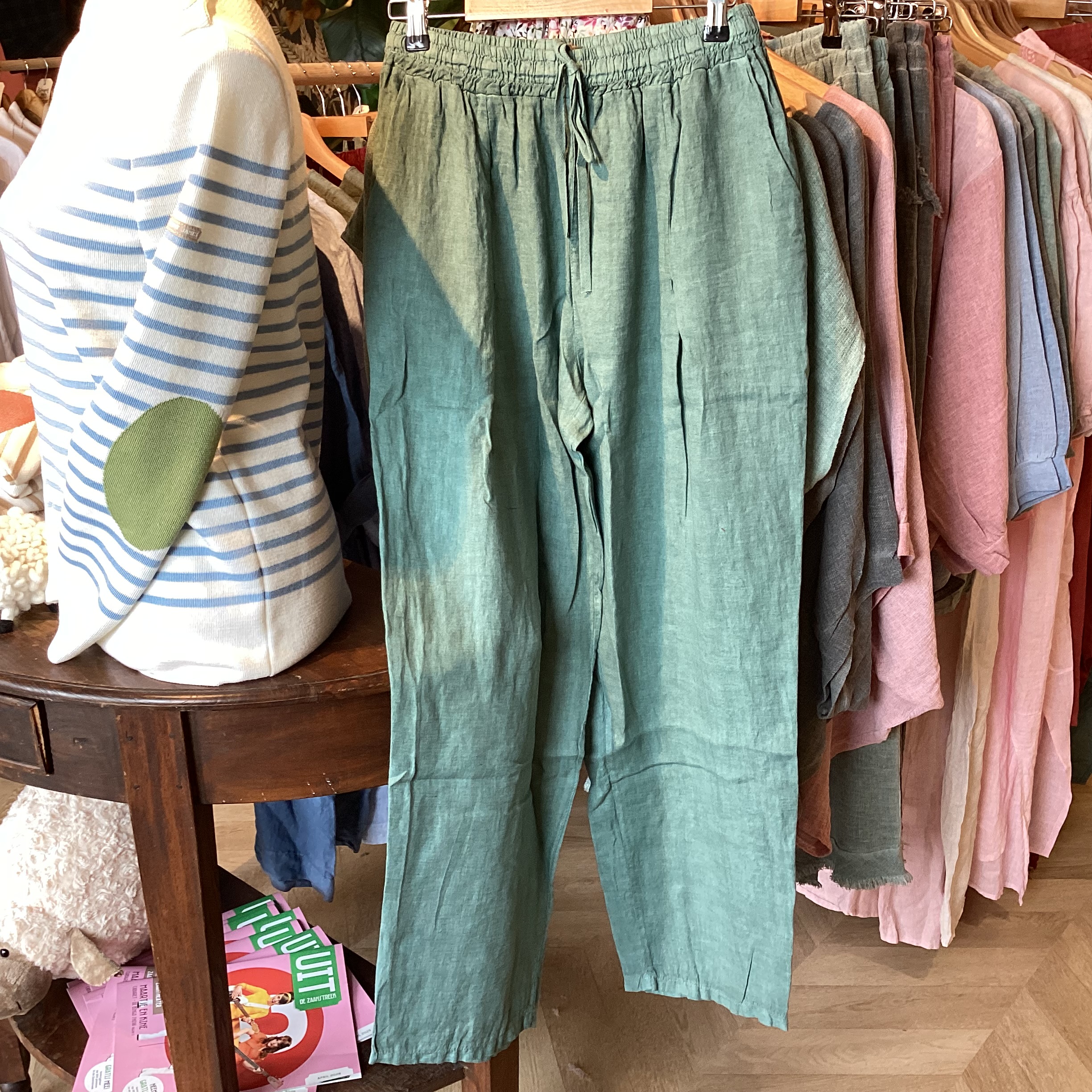 100% linnen broek elastiek en koord in de taille.