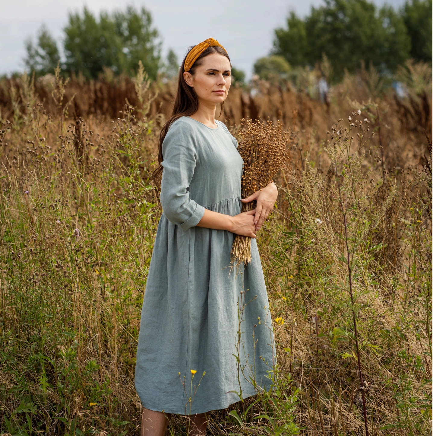 Mooie jurk met ronde hals van middelzware kwaliteit linnen.